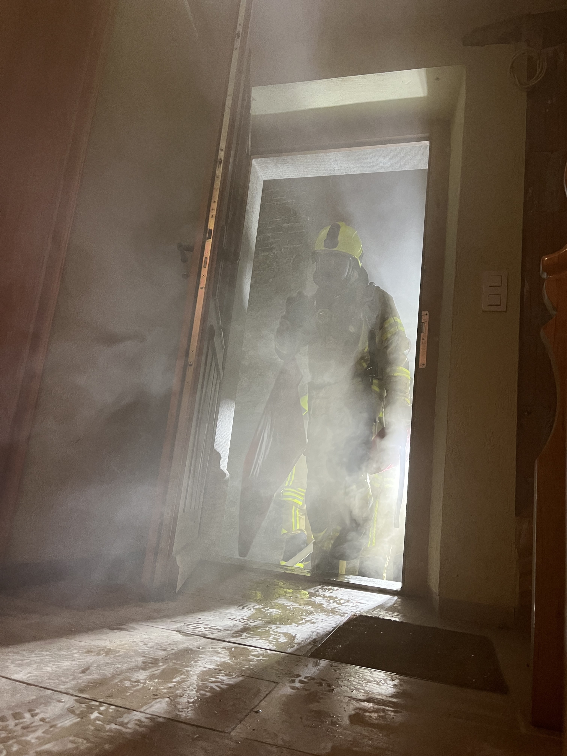 Bei unserem Eintreffen am „Einsatzort“ konnte der betroffene Keller durch stark austretenden Rauch schnell entdeckt werden. Sofort machten sich zwei Trupps unter schwerem Atemschutz auf den Weg in den Keller zur Personensuche und um erste Löschmaßnahmen zu ergreifen.